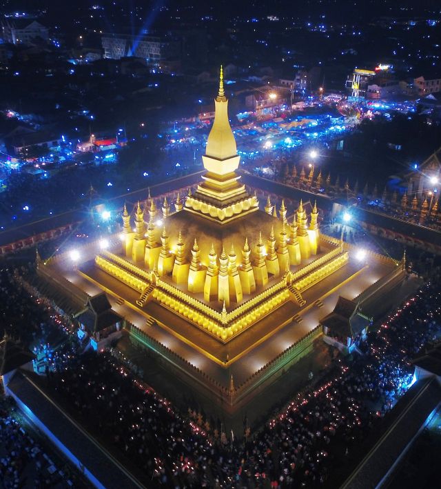 ↑这是2017年11月3日在老挝首都万象拍摄的塔銮夜景。塔銮是老挝最著名的佛塔,每年11月都会在此举行盛大的塔銮节。