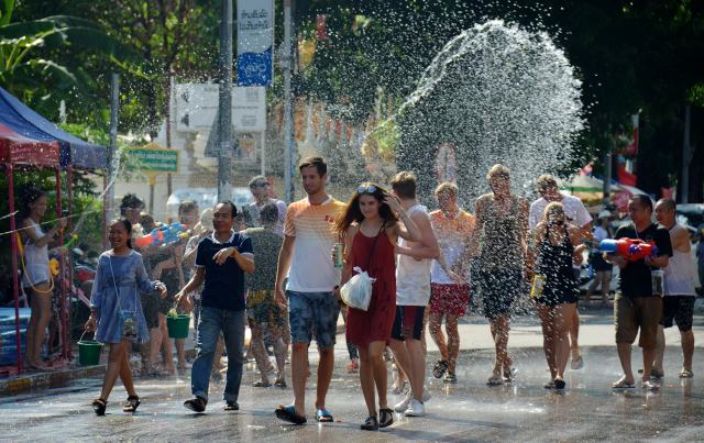 ↑这是2017年4月14日拍摄的游客在老挝首都万象市区参加老挝新年庆祝活动的资料照片。