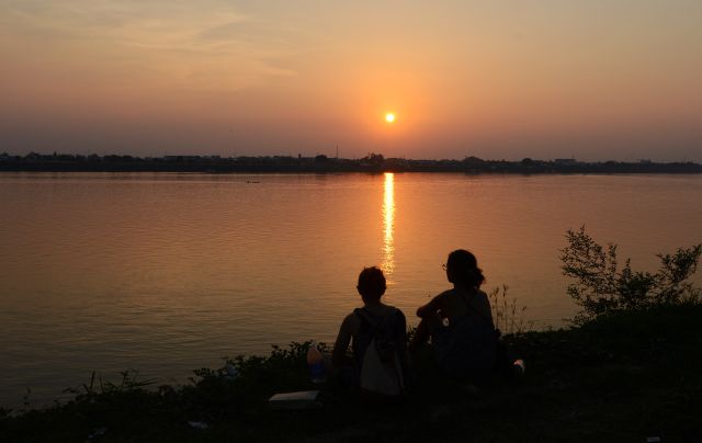 ↑这是2017年5月1日拍摄的游客在老挝甘蒙省他曲市湄公河畔看日落的资料照片。