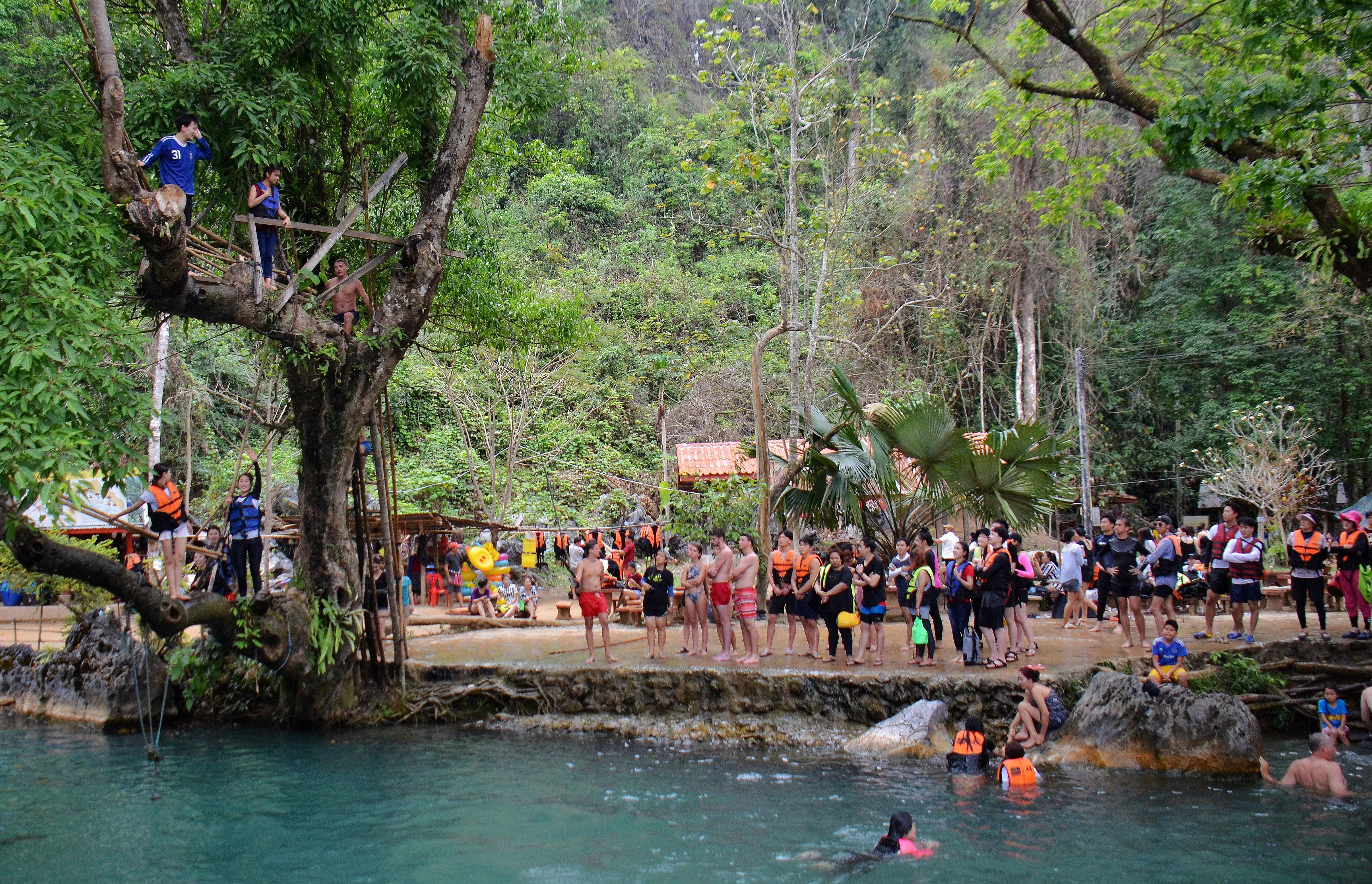 ↑这是2017年4月1日拍摄的游客在老挝万荣戏水避暑的资料照片。位于老挝首都万象以北约150公里处的万荣是老挝知名的休闲旅游胜地,它坐落于南松河畔,以喀斯特地貌闻名,风光秀丽。