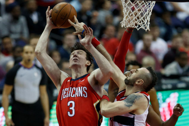 ↑12月19日,鹈鹕队球员阿西克(左)与奇才队球员戈塔特(右)争抢篮板。