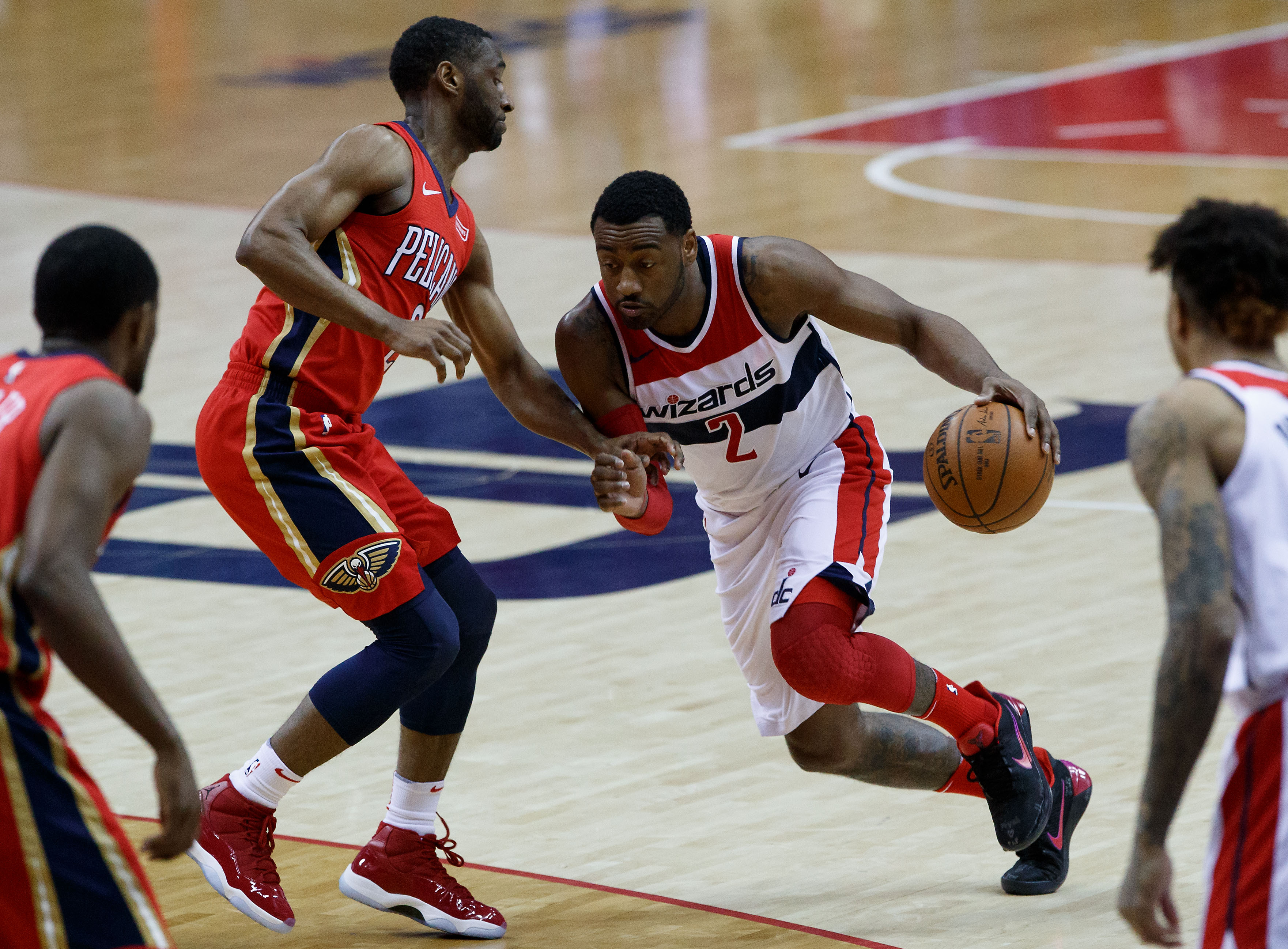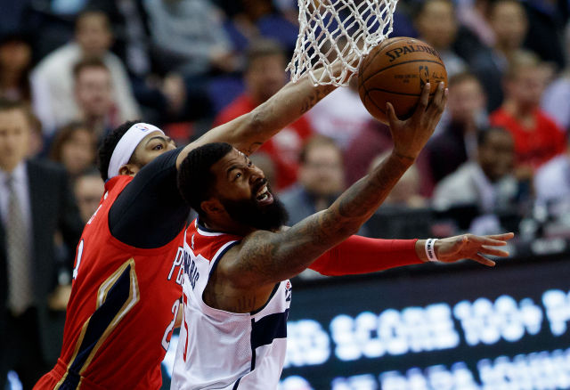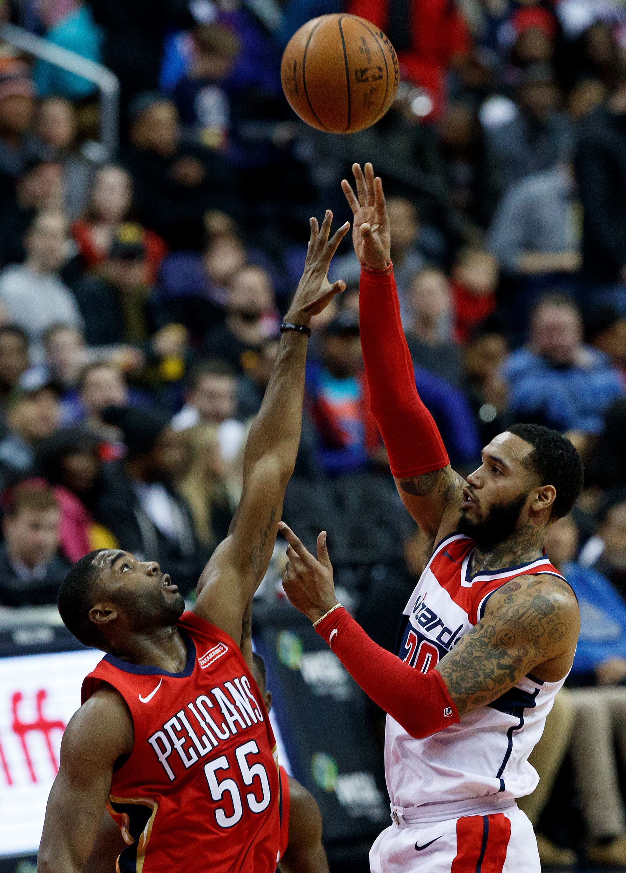 在2017-2018赛季NBA常规赛中,华盛顿奇才队主场以116比106战胜新奥尔良鹈鹕队。奇才队球员沃尔(中)在比赛中运球突破。奇才队球员米克斯(右)在比赛中投篮。鹈鹕队球员阿西克(左)与奇才队球员戈塔特(右)争抢篮板。