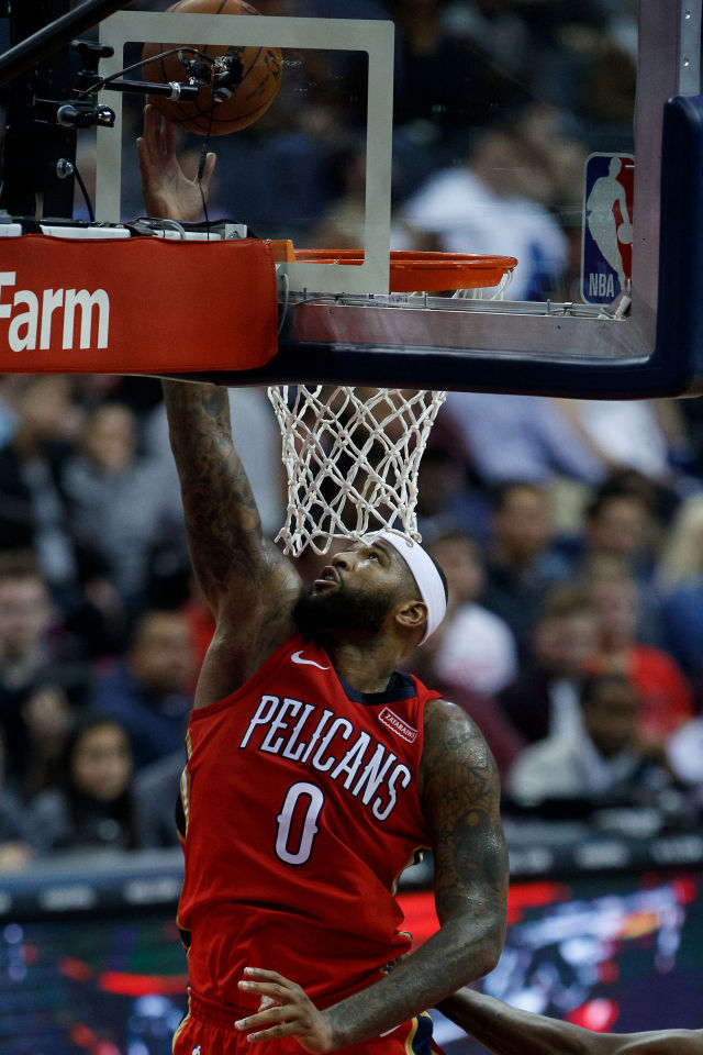 ↑12月19日,鹈鹕队球员考辛斯在比赛中上篮。新华社发(沈霆摄)