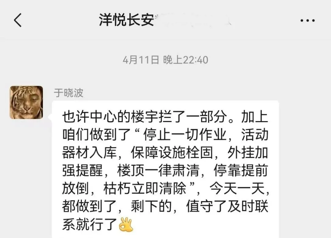今年4月,接到极端大风天气预警后,于晓波与社区书记穿梭在社区的各个楼栋和商户里,从白天到深夜,对有掉落风险的隐患物品一一记录,再挨家挨户通知当事人,他还在社区群内编写防范顺口溜,告知居民务必提前做好防护措施,确保自身安全。