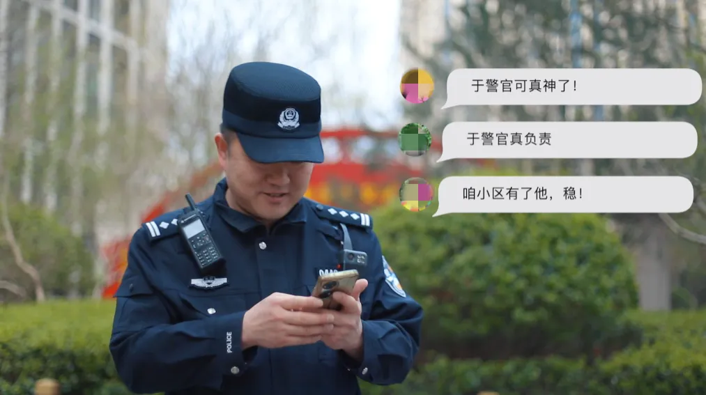 在和居民交流时,他还有自己的“小巧思”——用百姓接受度更高的方式和他们交流。翻开他在社区群里的聊天记录,开展政策解读时,他是措辞严谨、法理明晰的 “于警官”;遇上家长里短的琐碎事,他秒变机灵能动、“眼里有活” 的 “小于”;而当居民们带着心事来倾诉,他又化身为知无不言、言无不尽的 “于大哥”。
