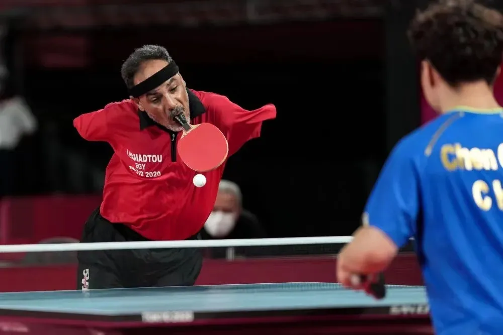 为梦想坚持的还有一位大叔——用嘴打乒乓球的埃及选手哈马托。