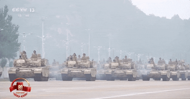 阅兵中,由99B坦克、100坦克、100支援战车编成的地面突击方队呈“箭”形布阵,寓意打赢之箭、胜利之箭。