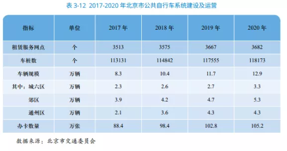 2020年北京市完成378公里慢行系统综合治理,完成对两广路、安乐林路、三里屯路、北苑路等道路步行道、自行车道改造整治。截至2020年底,公共自行车车辆规模12.9万辆,共享单车规模为84.4万辆。