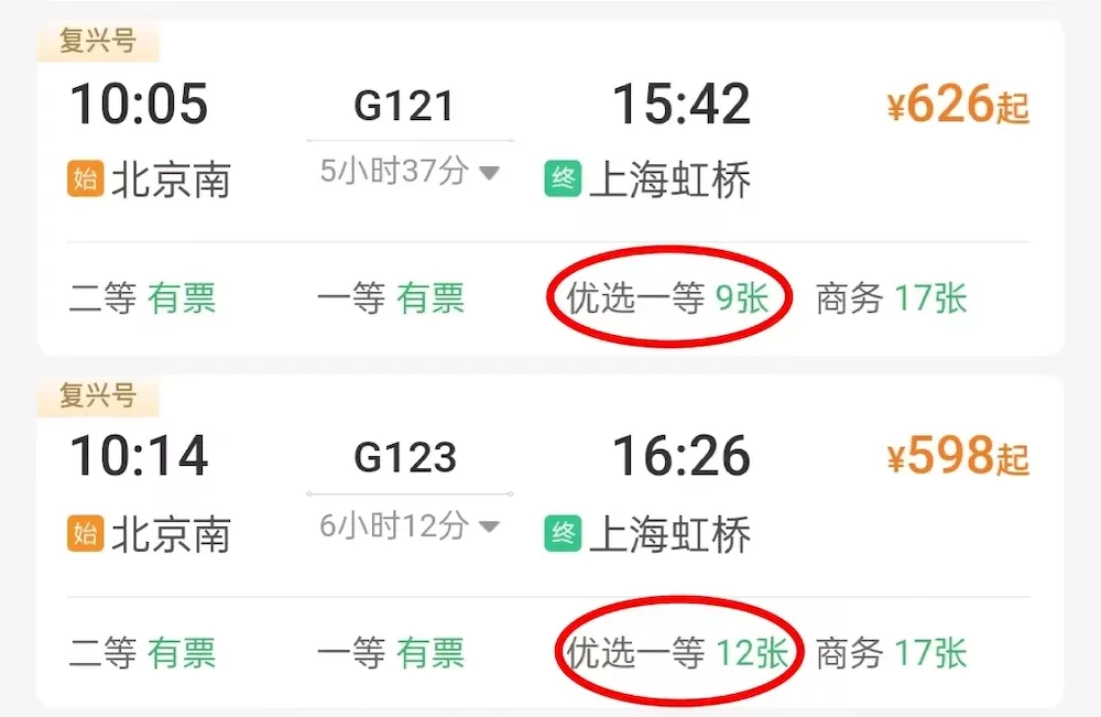 优选一等座席、商务座座席