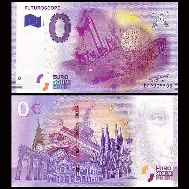 0欧元纸币是欧洲中央银行在2015年首次正式发行的纪念品。大小和一张20欧元纸币差不多,除了数字为0外,所有细节都按照正常流通欧元纸币制作。