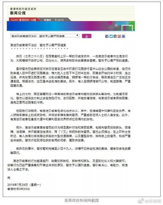 据中新社7月29日报道,香港特区政府发言人29日凌晨作出回应指,激进示威者目无法纪,以暴力破坏社会安宁,政府予以强烈谴责。