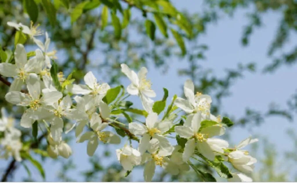 海棠“金雨点”:白色小花似雨点洒满整树,叶片如三裂山楂叶,秋色叶金黄色,具观赏性。