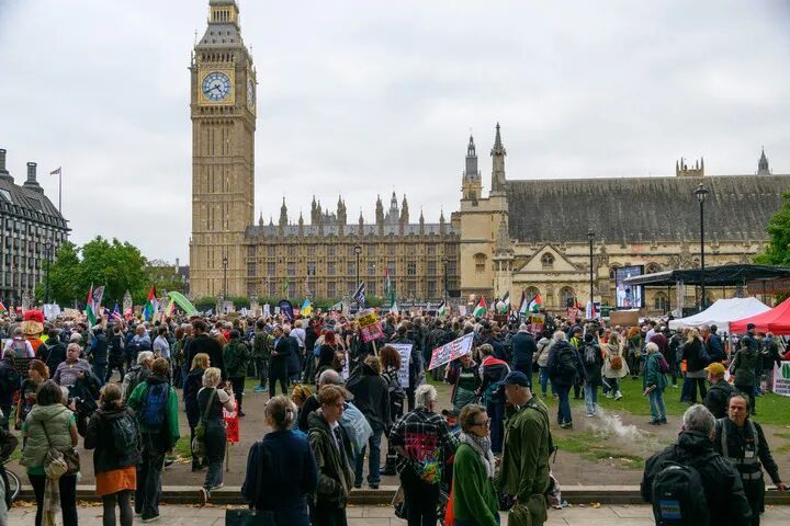 9月17日,抗议者在英国伦敦市中心手持标语抗议美国总统特朗普访英