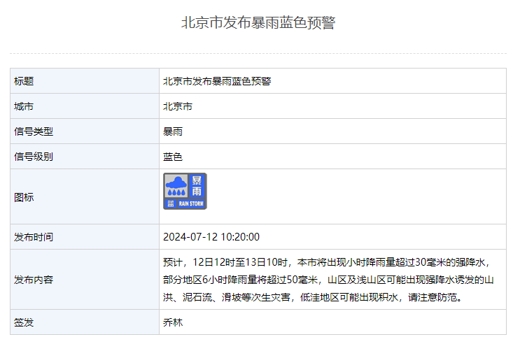 据北京市气象局官网消息,预计,12日12时至13日10时,本市将出现小时降雨量超过30毫米的强降水,部分地区6小时降雨量将超过50毫米,山区及浅山区可能出现强降水诱发的山洪、泥石流、滑坡等次生灾害,低洼地区可能出现积水,请注意防范。
