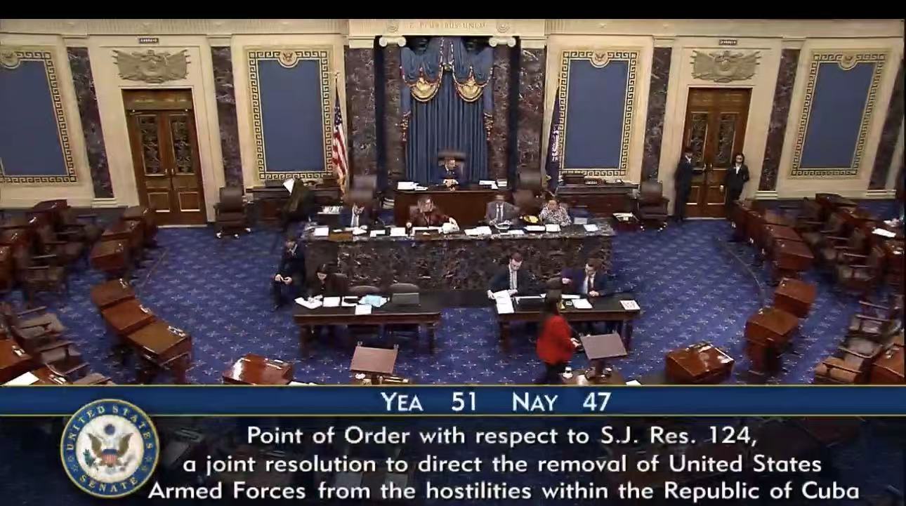 这项决议由多个民主党人提出,意在禁止特朗普动用武力推翻古巴政权。该决议最终在参议院被共和党人否决。