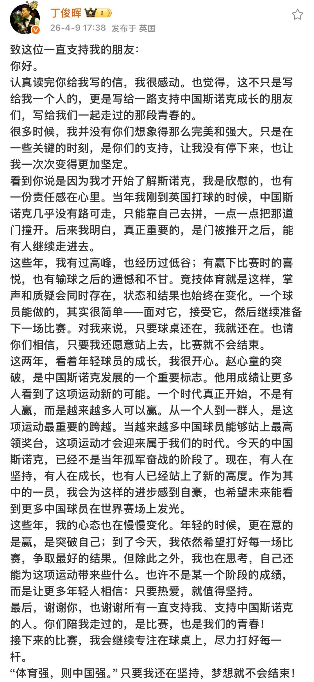 从丁俊晖的暖心寄语到赵心童的感恩回应,这一段互动令人为之动容,这也是两代中国斯诺克球员新老传承的生动注脚。