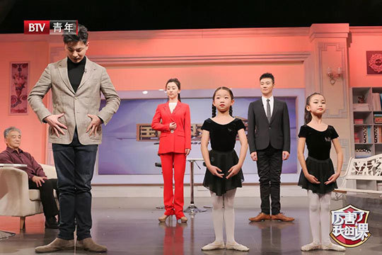 芭蕾中的行礼,跟普通的行礼不同,是训练礼仪形态的最直接动作。闫老师也带领两位小学员及主持人为观众朋友们演示上课前的“芭蕾式打招呼”。