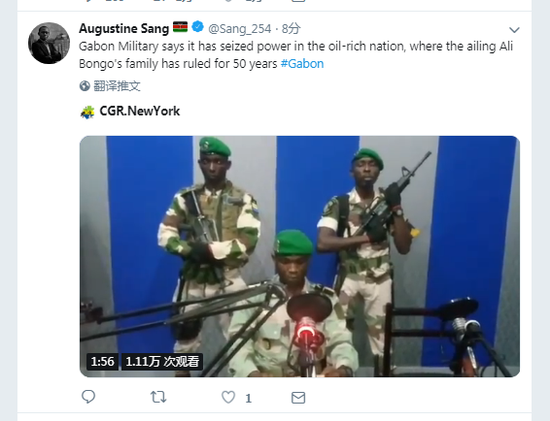 夺取电台后,军官们宣读了一份声明,谴责总统阿里·邦戈(Ali Bongo)。报道称,邦戈自去年10月中风以来,于上周一在摩洛哥首次向同胞发表讲话。
