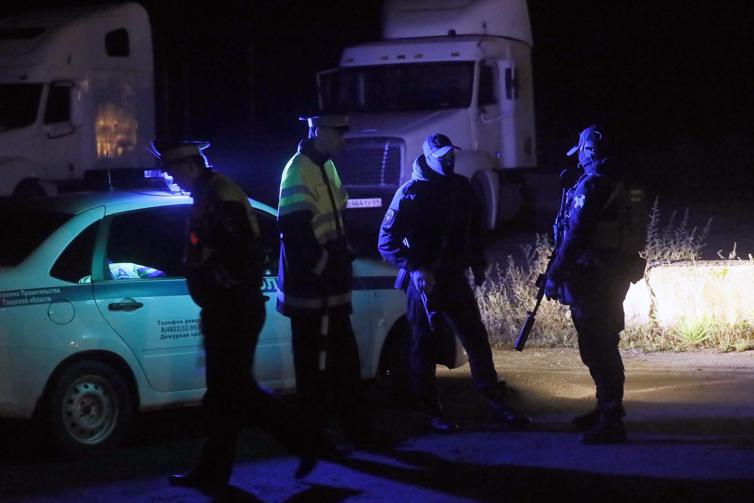 当地时间2023年8月23日,俄罗斯特维尔州,俄罗斯警察封锁坠机现场。