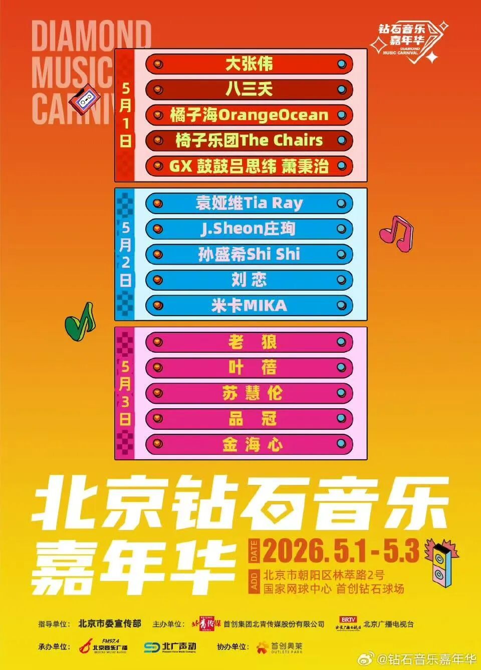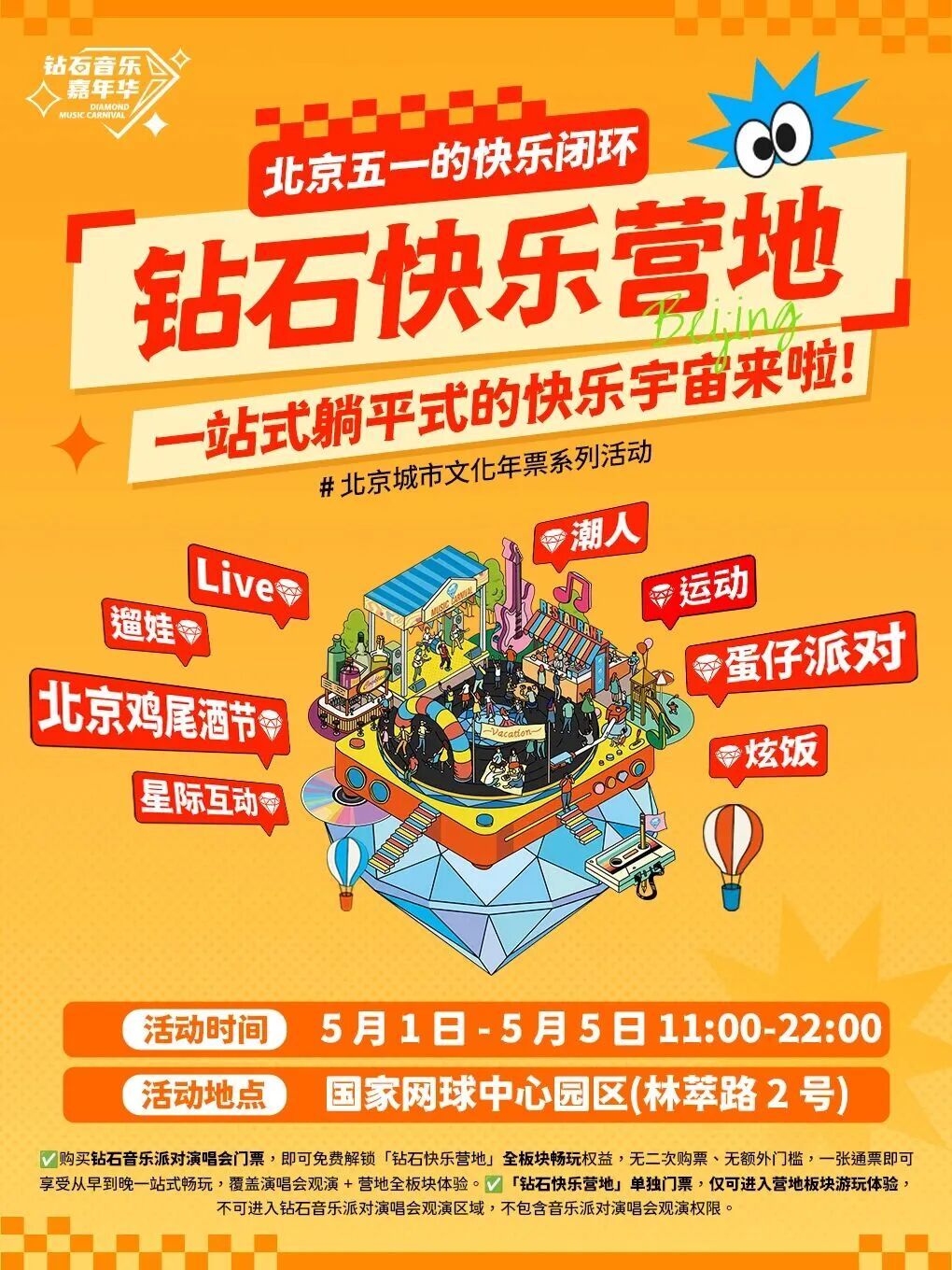 五一假期狂欢值即将拉满!市区地铁直达的超级音乐盛宴来啦????2026北京钻石音乐嘉年华承包你整个五一的快乐~王炸阵容暴击!连续3天钻石音乐派对,嗨到腿软!蹦迪、合唱,把所有不开心全甩掉;天籁嗓音裹着晚风,氛围感直接拉满;老歌一响,全场大合唱泪目预定!