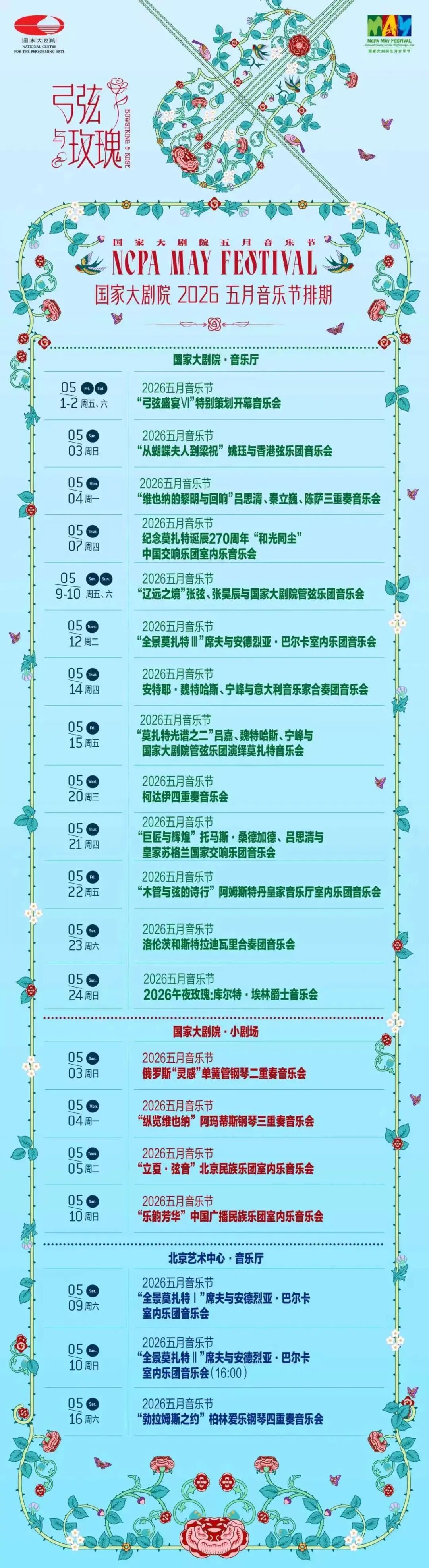 本届音乐节以“弓弦与玫瑰”为主题,以纪念莫扎特诞辰270周年为主线,汇聚全球顶尖艺术家与团体,于5月1日至24日带来22场精品演出,打造兼具艺术深度与浪漫氛围的五月音乐盛宴。2026年适逢“音乐天才”莫扎特诞辰270周年,本届五月音乐节以莫扎特作品贯穿始终,用室内乐的细腻形式回溯古典主义黄金时代的纯粹与优雅。本届音乐节阵容堪称星光熠熠,中外独奏名家联袂登场,国际顶级室内乐团体悉数亮相,国家大剧院管弦乐团深度参与多场重磅演出,弦乐、管乐、钢琴、交响室内乐多元呈现,全方位展现室内乐的协作之美与艺术魅力。