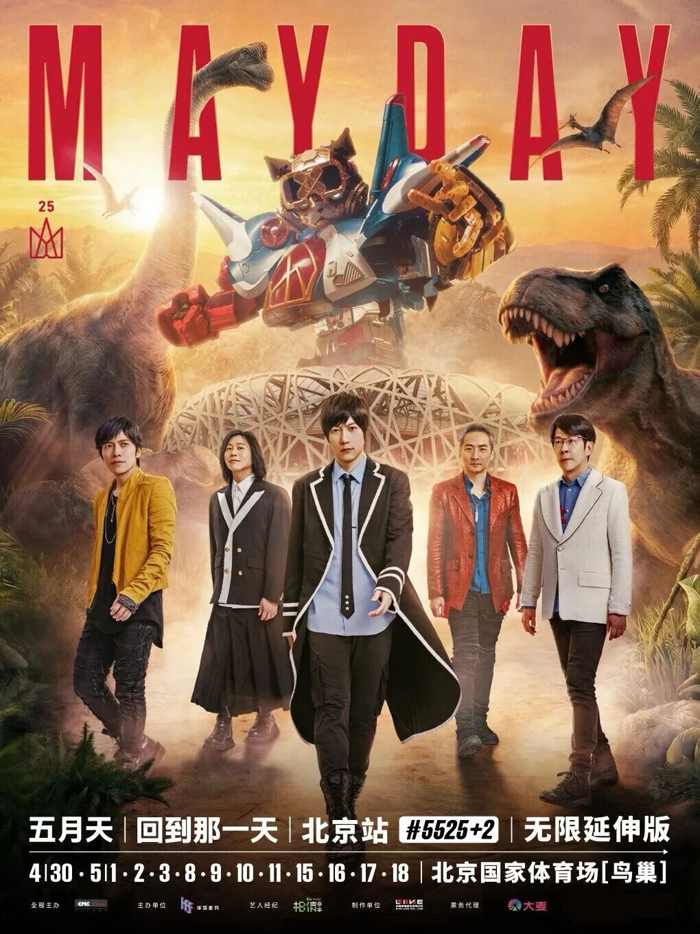 有你的每一天,都是五月天想回到的那一天。[#5525 回到那一天]音乐旅程自2023年底起跑,历经四个年份,精彩灿烂写下无数难忘的现场新回忆。五月天[ #5525+2 回到那一天]25周年巡回演唱会 北京站·无限延伸版,2026.4.30-05.03,05.08-05.11,05.15-05.18,于北京国家体育场(鸟巢),旗舰主题再进化#5525+2!本次主题巡演在鸟巢首度开设横向舞台,也将有惊喜彩蛋新角色恐龙现身,将鸟巢打造成欢乐侏罗纪概念的未来奇幻Maydayland。寒武纪到侏罗纪到新世纪,五月天陪你再活一千个世纪!