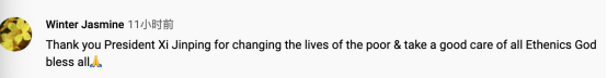优兔网友Winter Jasmine留言:“感谢习近平主席,他改变了穷人的生活,把中国所有民族的人民都照顾的很好。”