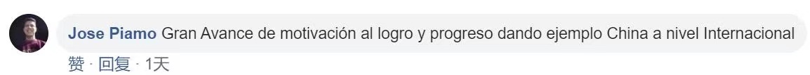 西班牙语脸书网友Jose Piamo留言:“中国的成就和进步为国际社会树立了榜样。”