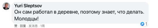 俄语脸书网友尤里•斯列普佐夫留言:“他(习近平)本人就曾在农村工作,所以深知应该做些什么。好样的!”