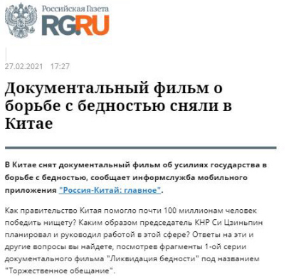 俄罗斯政府机关报《俄罗斯报》转发中俄头条报道称,中国政府如何帮助近1亿人摆脱贫困?中国国家主席习近平如何在这方面指挥开展工作?通过观看《摆脱贫困》纪录片,您将找到这些问题的答案。