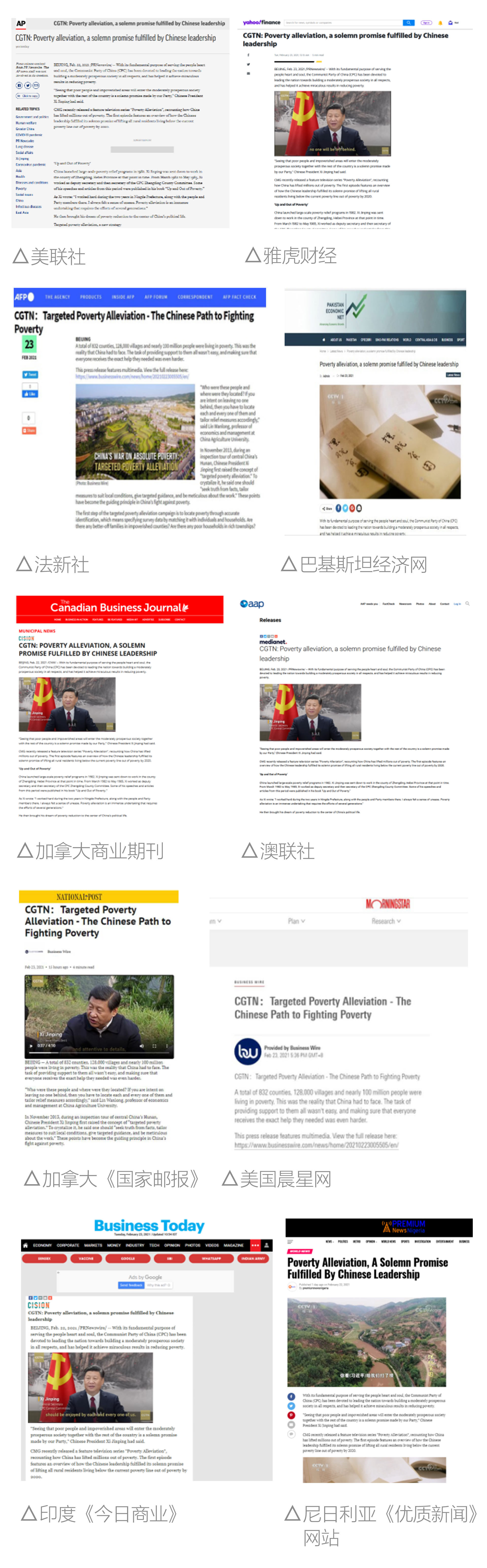 总台CGTN发布特稿《摆脱贫困:中国领导人的庄严承诺》《精准扶贫:中国特有的扶贫道路》,全面展现我国经过八年持续奋斗,如期完成脱贫攻坚目标任务奋斗历程,创造出世界瞩目的非凡成就。获得美联社、雅虎财经、法新社、美国晨星网、欧罗巴通讯社、澳联社、加拿大商业期刊、印度《今日商业》杂志等1100多家海外主流网络媒体转载,累计触达海外受众6.96亿人次。