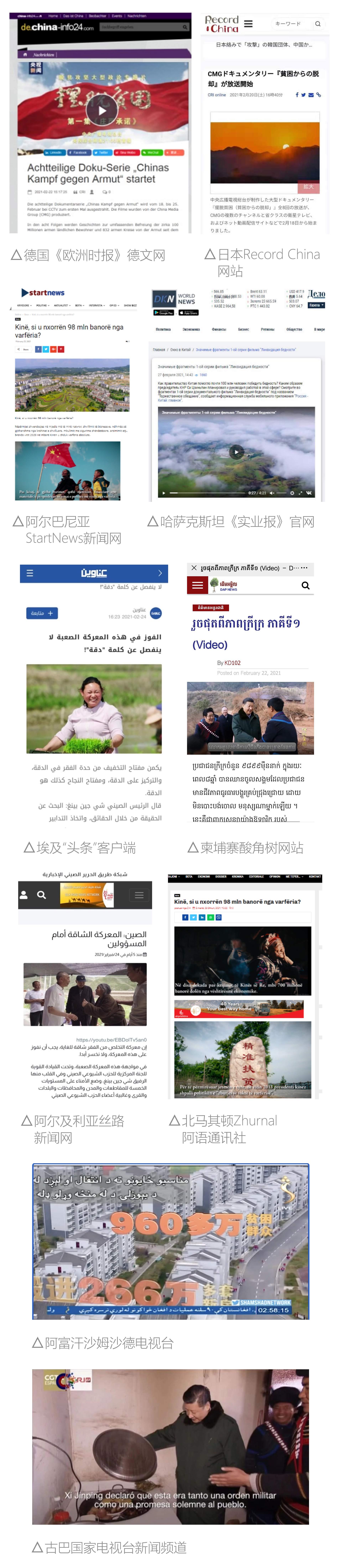 德国《欧洲时报》德文网、日本最大中国资讯门户网站Record China、阿尔巴尼亚StartNews新闻网、北马其顿Zhurnal通讯社、埃及“头条”客户端、阿尔及利亚丝路新闻网、哈萨克斯坦《实业报》、古巴国家电视台新闻频道、阿富汗沙姆沙德电视台、柬埔寨酸角树网站等多国主流媒体转引转载《摆脱贫困》相关报道及精编版视频。