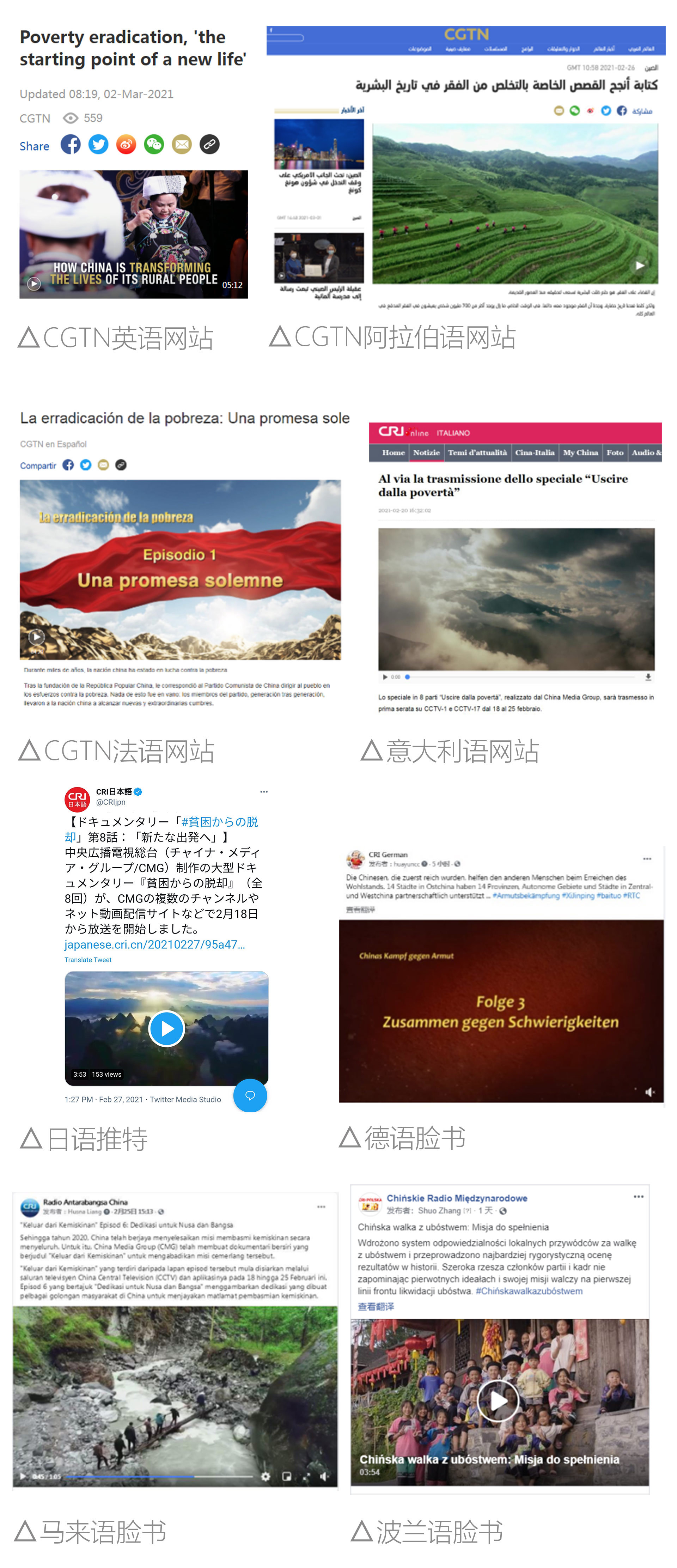 总台44种语言融媒体编译播发《摆脱贫困》相关报道,讲述鲜活的中国扶贫脱贫故事,解读“精准脱贫”等充满中国智慧的重要理念,通过脸书、优兔、推特等海外社交媒体广泛传播。