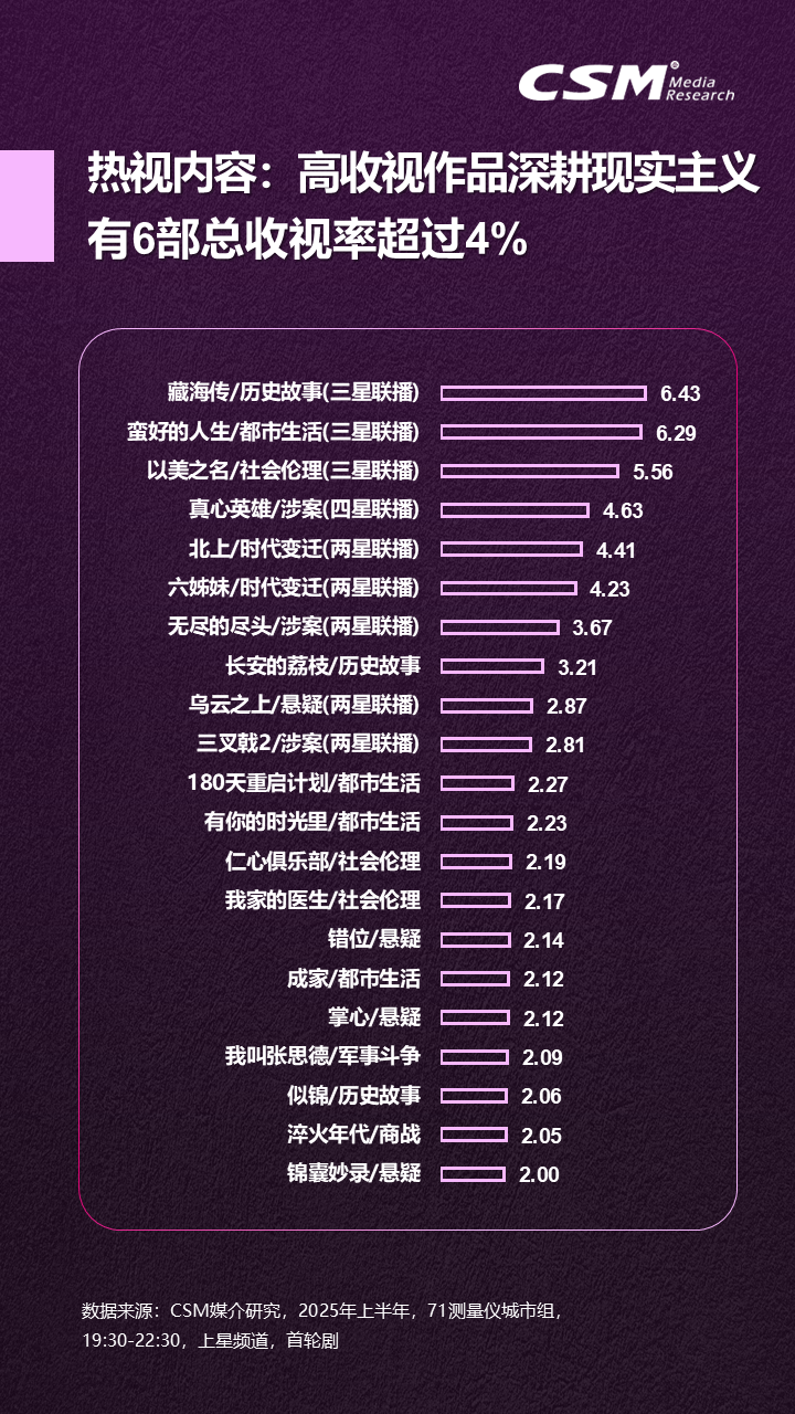 其中,CSM媒介研究数据显示,悬疑题材以10部的数量领跑首播剧集品类,现实主义作品持续突破,6部作品总收视率超4%,成为市场刚性支柱。