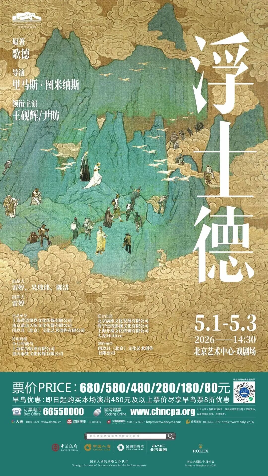 文华奖得主王砚辉饰演浮士德,松弛的演技将重返青春的“淘气”与孤独融于一身——敷着面膜追女孩、蹬腿撒娇,滑稽与悲剧在他身上奇妙共存。尹昉饰演魔鬼墨菲斯特,舞者出身的他以惊人肢体塑造出优雅又癫狂的形象,银发红袜、长尾摇曳,被观众称为“愿意被他诱惑的魔鬼”。5月1日-3日,北京艺术中心·戏剧场,看戏骨与舞者演绎这场灵魂博弈。
