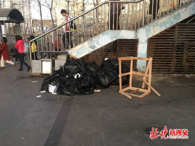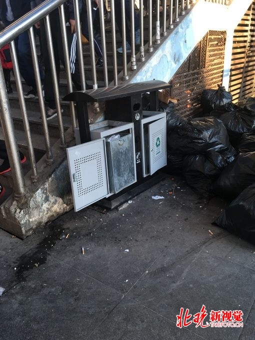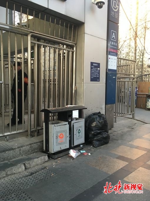 早晨七点的的天通苑地铁站A口,废物箱外丢着烟头塑料袋,旁边堆放着还未清运走的垃圾袋“之前,因为附近缺少垃圾桶,很多上班的人吃完早餐直接将食品袋丢在地上。”小马说,那段时间社区里很多人都质疑,这么大客流量的地铁站口,为什么不能多放几个垃圾桶?