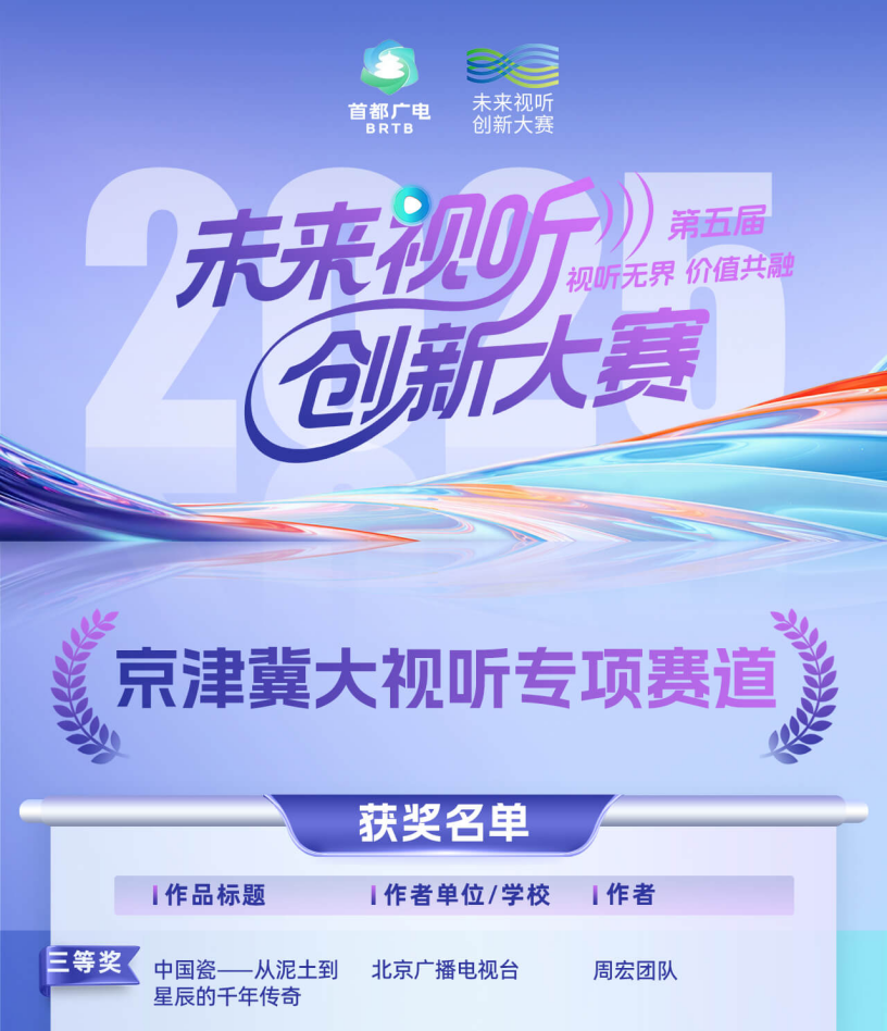 本届大赛由北京市广电局、北京市新闻工作者协会共同主办,自2025年9月启动以来,共收到全国389家单位提交的1436个作品和项目。经初赛、复赛评审及大赛组委会审议,选出高品质视听赛道中的“沉浸式交互视听”“AI智能影像”“媒体视听新技术”三个分赛道、泛视听服务赛道和京津冀大视听专项赛道的获奖作品、项目。北京广播电视台作品《中国瓷-从泥土到星辰的千年传奇》荣获京津冀大视听专项赛道三等奖。
