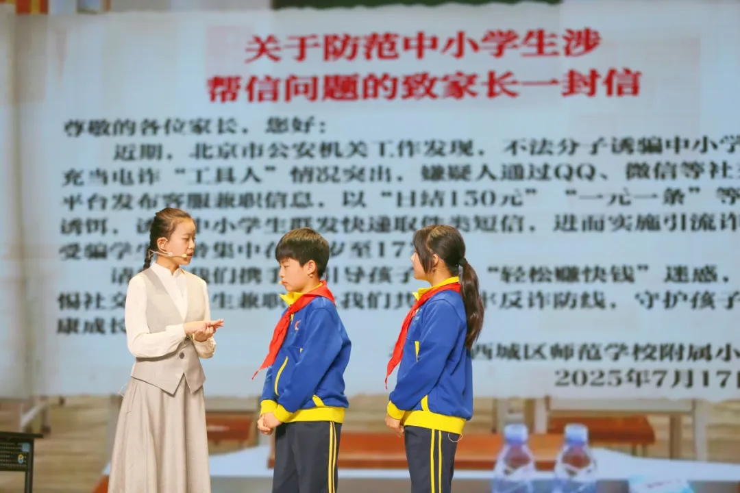 北京市西城区奋斗小学的《一张照片的背后》直面AI时代的新型侵权问题;北京第二实验小学的《星途迷雾》揭开骗子“演技派”真面目;北京市西城区师范学校附属小学的《“轻松”的陷阱》揭示“点点手机就赚钱”背后的骗局。