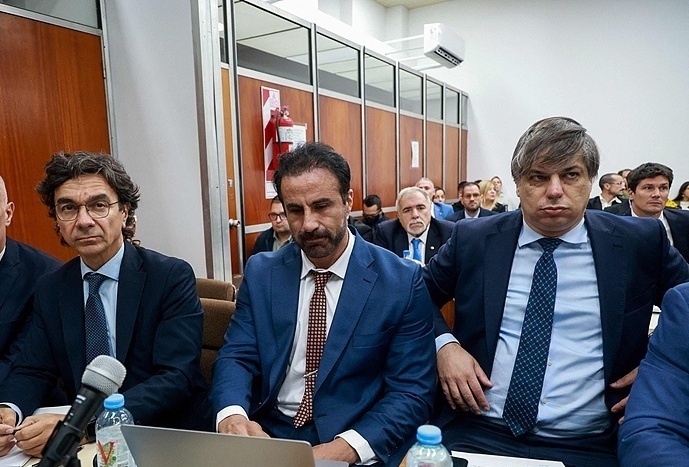 △当地时间4月14日,马拉多纳的私人医生莱奥波尔多·卢克(中)出席听证会