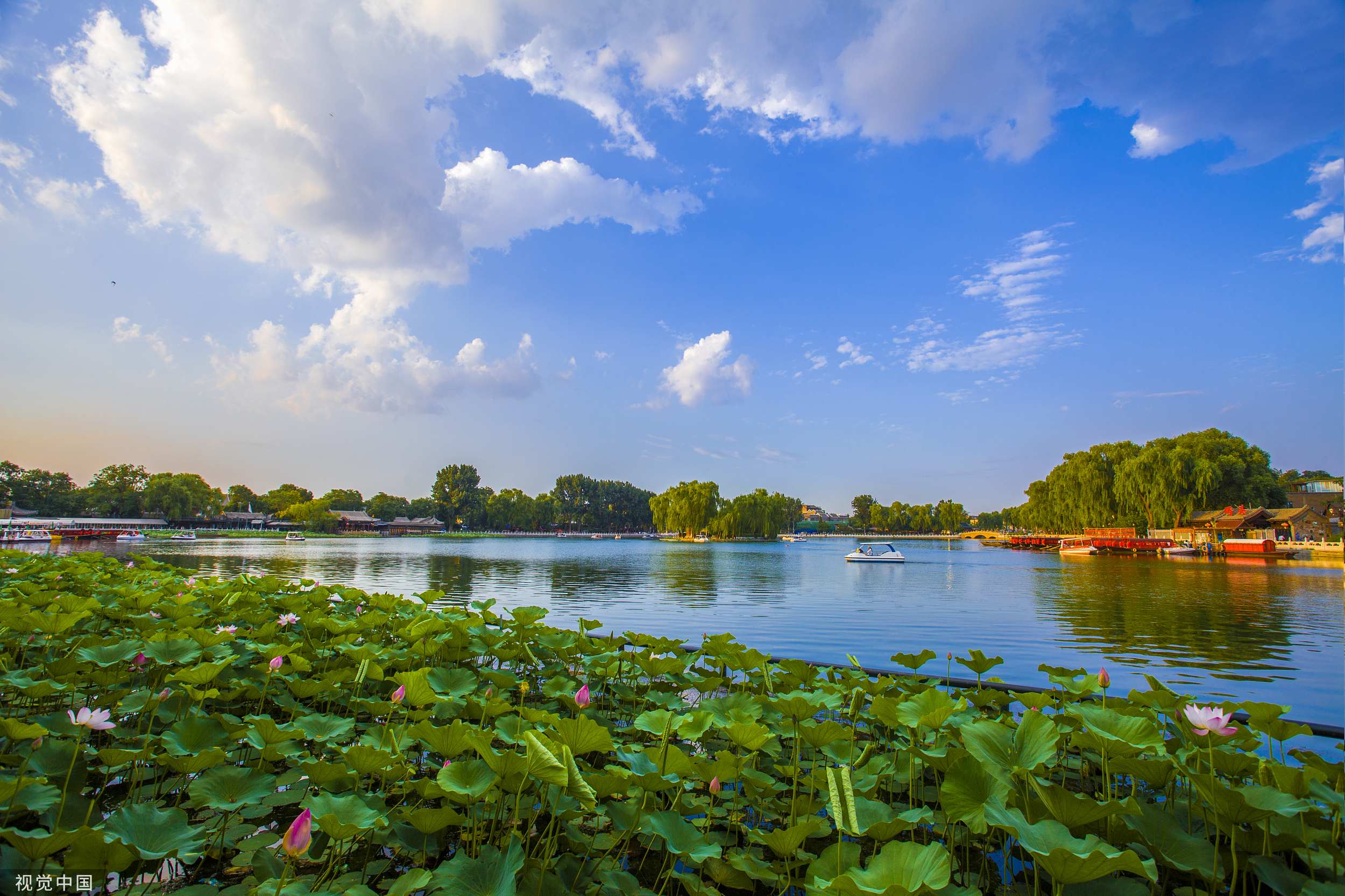 盛夏的什刹海景区荷叶盈池、绿柳拂堤,风光旖旎、景致独特。沿着湖岸漫步,路边皆是青砖灰瓦的小院,红花绿枝掩映在亭台楼榭之间,偶有人力三轮车“叮当”驶过,恬静而不失灵动。天气晴朗时,可以站在银锭桥上感受“燕京小八景”之一的“银锭观山”。