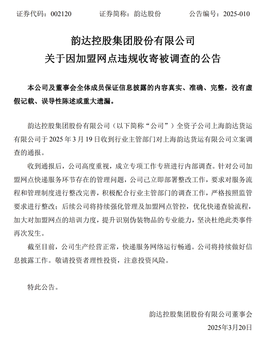 韵达股份公告,全资子公司上海韵达货运有限公司于2025年3月19日收到行业主管部门对上海韵达货运有限公司立案调查的通报。收到通报后,公司高度重视,成立专项工作专班进行内部调查。针对公司加盟网点快递服务环节存在的管理问题,公司己立即部署整改工作;后续公司将持续强化管理及加盟网点管控,优化快递查验流程,加大对加盟网点的培训力度,提升识别伪装物品的专业能力,坚决杜绝此类事件再次发生。【国家邮政局依法对上海韵达货运有限公司立案调查】
