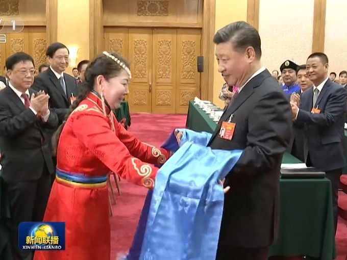 当习近平走进会场时,全场起立热烈鼓掌。鄂温克族代表向习近平献上蓝色的哈达,表达内蒙古各族群众对党中央和总书记的敬意。习近平向他们表示感谢,并请他们转达对各族干部群众的诚挚问候。