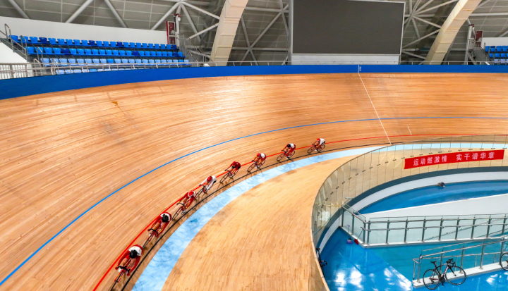 置身赛道中圈,被环绕场地的斜坡式标准赛道包围,除了震撼之余,还能够窥探到一些小细节:在赛道的不同位置,其坡度也不尽相同。整个赛道坡度最小的地方13度,最大可以达到45度。赛时,选手在场地上骑行,最快速度可以达到每小时70多公里。这么快的速度,对场地赛道的要求不言而喻。整个赛道表面采用了374块有着300年以上树龄的进口赤松木板拼接而成。如果按照这样的配置来一套,耗费的财力可不是小数目。