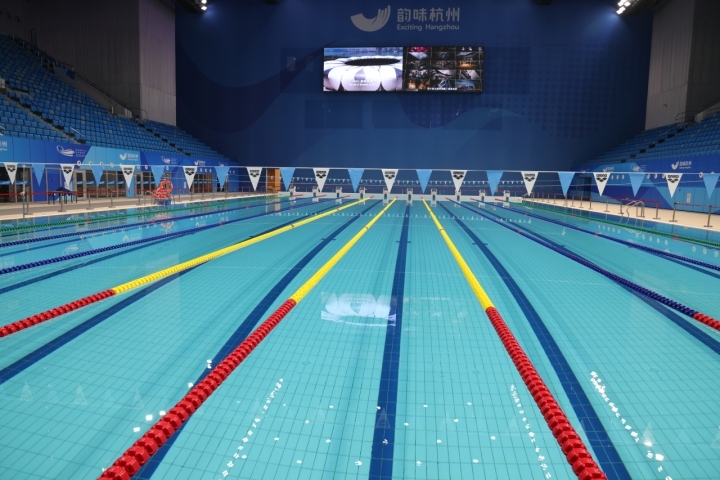 步入杭州奥体中心游泳馆,游泳比赛池和跳水池的池水在灯光的映衬下清得发亮,让人只想一个猛子扎下去畅游两圈。
