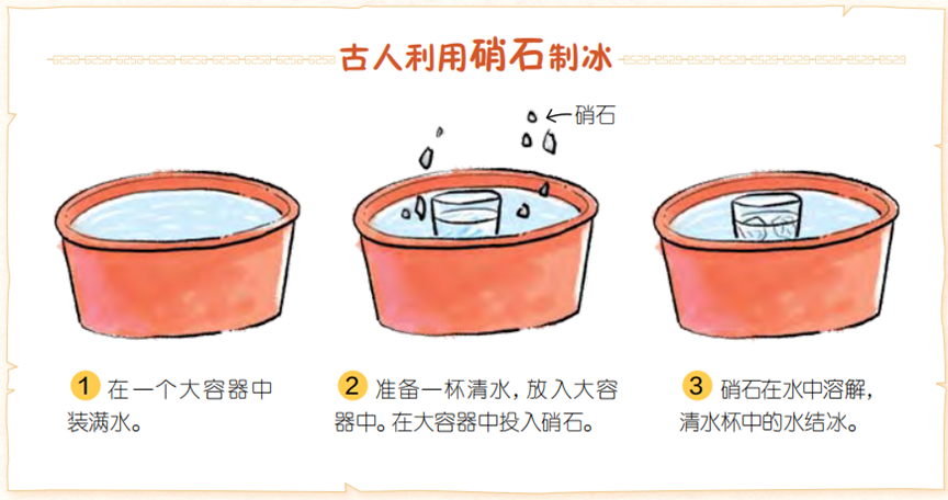 说起来这也是一个美妙的巧合:唐代人为了生产火药开采了不少硝石,机智的人们意外发现硝石溶于水后会吸收大量热量,从而使周围迅速降温。利用这个原理,人们开始“点水成冰”,大大提高冰块产量。