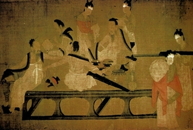 还是来看看真正的文物——北齐杨子华的《北齐较书图》,画上正在工作的学士穿的都是透明纱衣。