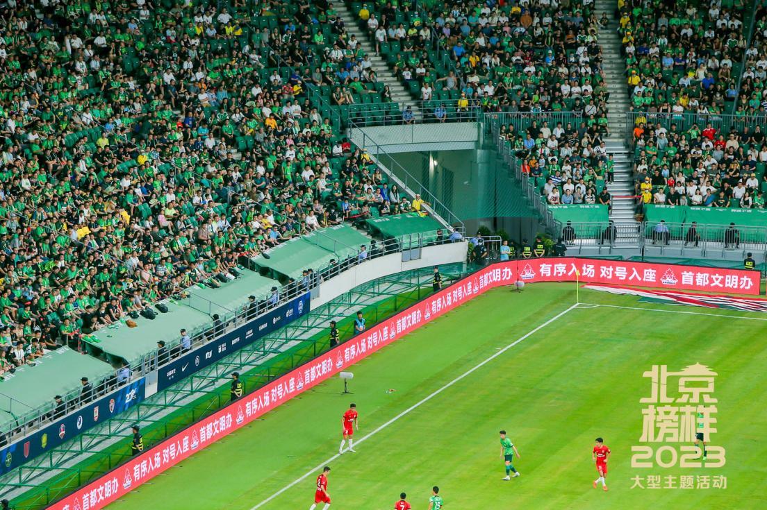 6月29日,2023赛季中国足球协会超级联赛第十三轮比赛在北京工人体育场举行。本场比赛为北京国安队对阵上海海港队,场上运动员激烈交锋,场下观众奋力呐喊,比赛双方紧追不舍,引来阵阵热浪般的掌声。