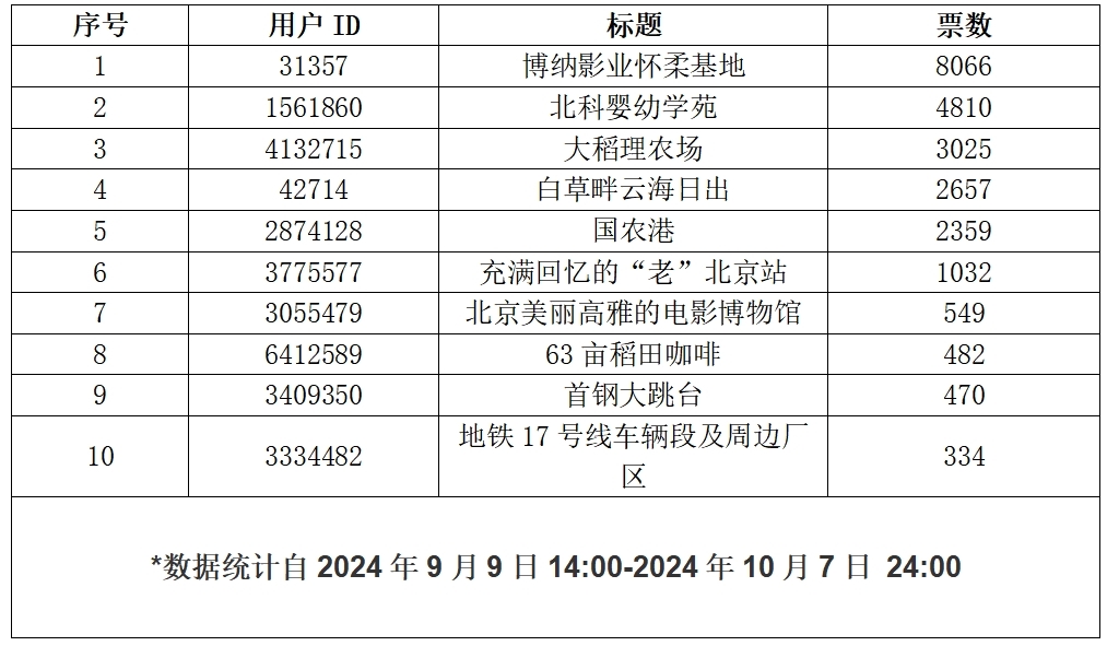 2024年9月9日,北京时间上线“我的北京我的家——上新了北京”新地标征集活动,广泛征集全网网民心中北京的代表性地标图片或视频作品,展示北京新风貌!根据活动规则,“我的北京我的家——上新了北京”新地标征集活动包含东城区、西城区、朝阳区、丰台区、石景山区、海淀区、顺义区、通州区、大兴区、房山区、门头沟区、昌平区、平谷区、密云区、怀柔区、延庆区、亦庄经济技术开发区,17个地区的新地标征集活动。活动结束后,在17个地区所有作品中,用户作品点赞量排名前10位的用户,将随机获得“我的北京我的家——上新了北京”征集活动精美礼品1份,同一用户ID仅能获得一次作品奖励机会。至活动结束,根据本次活动投票,获奖用户信息如下: