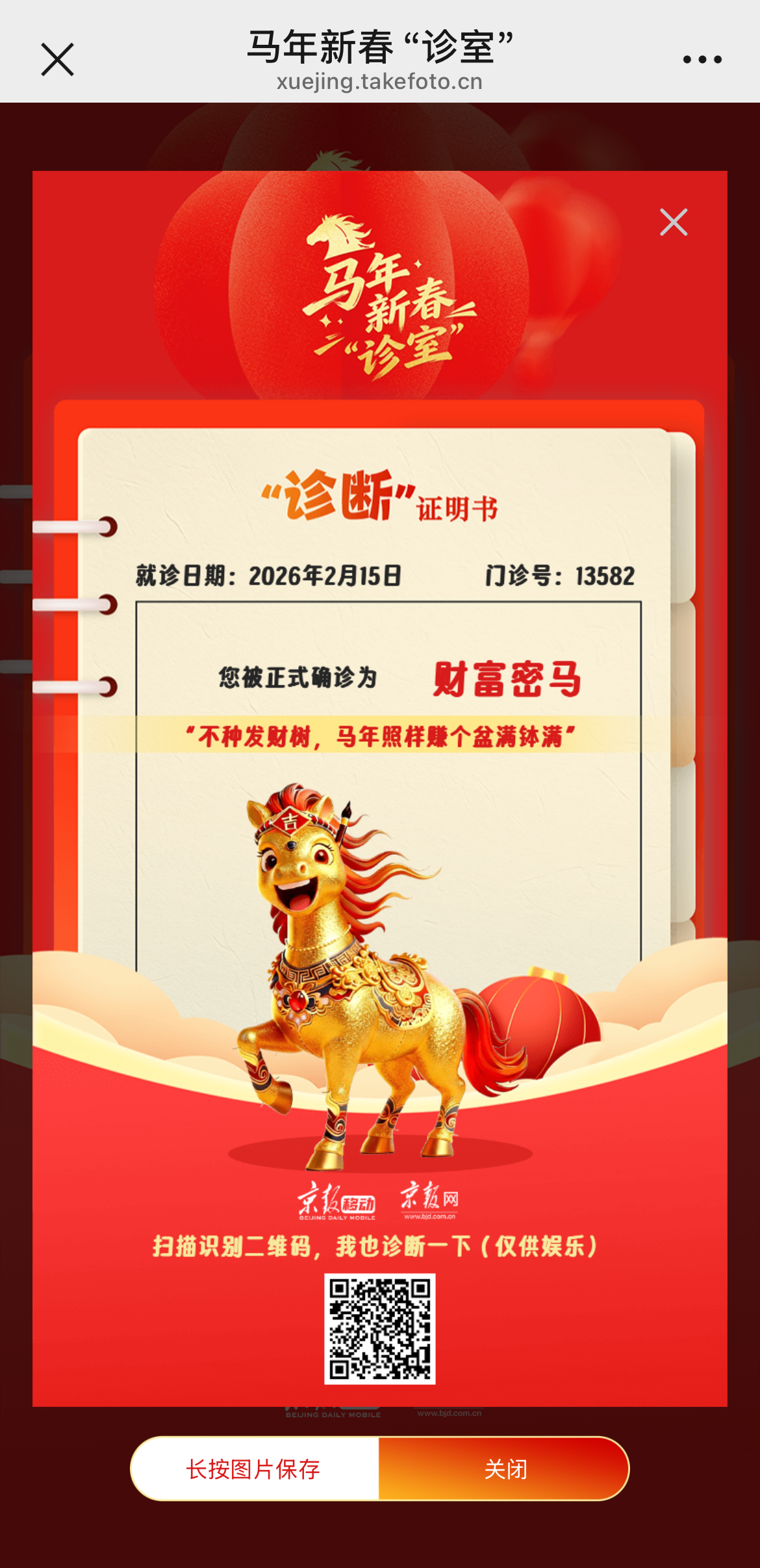 京报网推出趣味十足的“测测您是什么马”互动贺卡,可解锁“黑马”“收款马”等网感称号,诙谐有趣,快乐值拉满,精准贴合年轻用户喜好。