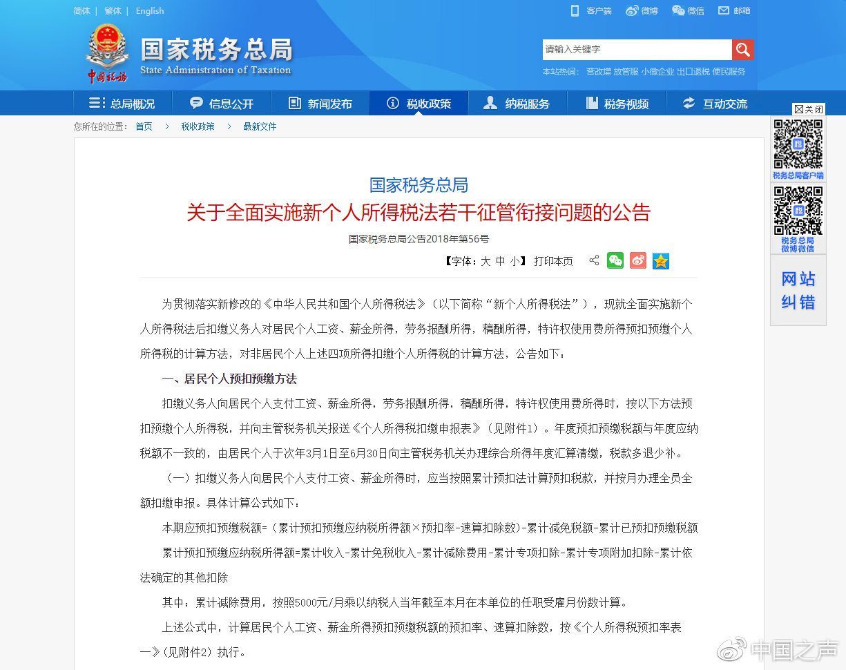 据中国之声《新闻纵横》报道:新修改的个人所得税法将于2019年1月1日正式实施。国家税务总局日前发布公告明确了全面实施新个人所得税法的征管办法,确保新旧税制平稳过渡。
